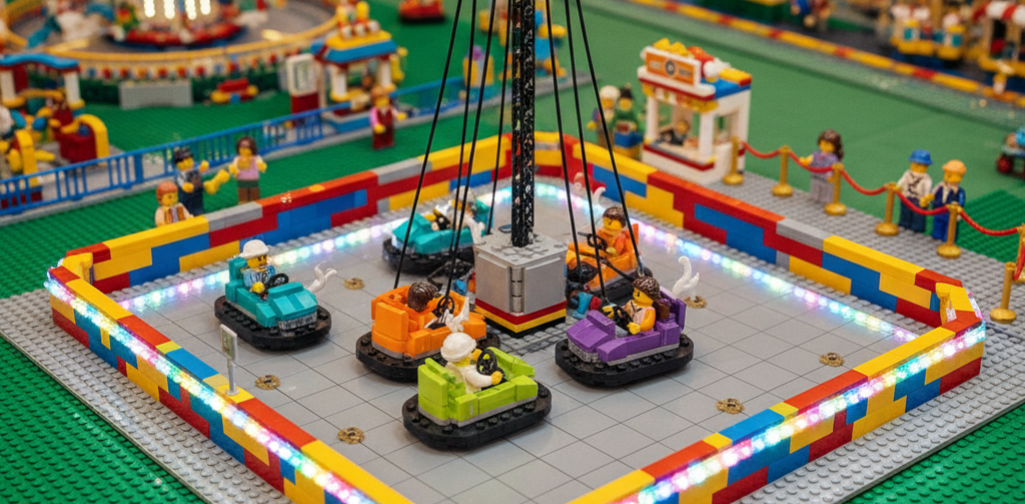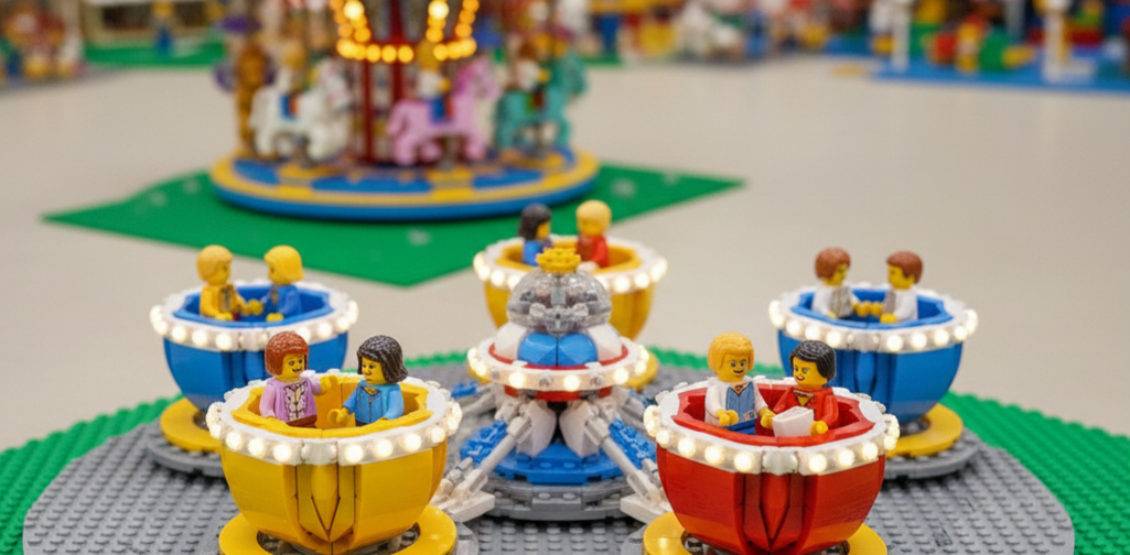 Ein "Teetassen"-Fahrgeschäft: Mehrere große Teetassen, die sich auf einer rotierenden Plattform drehen, wobei jede Teetasse zusätzlich manuell gedreht werden kann.