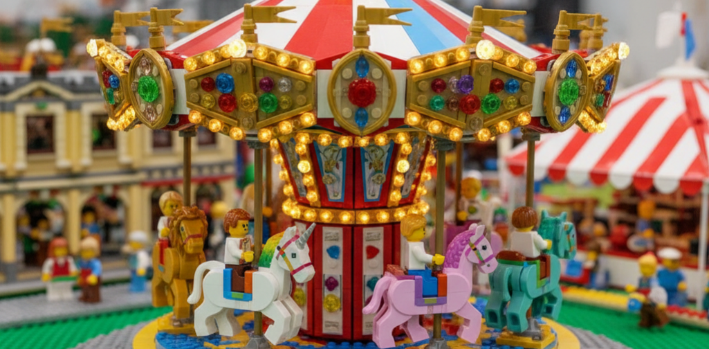 Ein buntes Karussell: Mit verschiedenen Tieren und einer drehbaren Plattform.